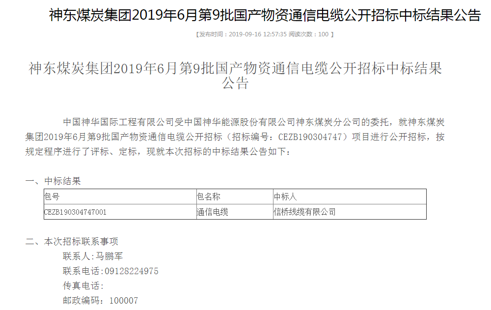 您好!歡迎來到信橋線纜有限公司官方網(wǎng)站!點擊數(shù):58042019-11-21 00:00:00 來源: 神東煤炭集團2019年6月第9批國產物資通信電纜公開招標中標結果公告